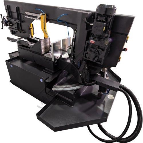 The blades are guided via roller bearings & tungsten carbide inserts offering superior rigidity, cutting accuracy and longer blade life. The feed is hydraulic controlled and fine-tuned from the control panel for the perfect feed rate required to suit your application. This band saw has a powerful coolant system and a blade tensioning device that shuts down the machine if the blade breaks.